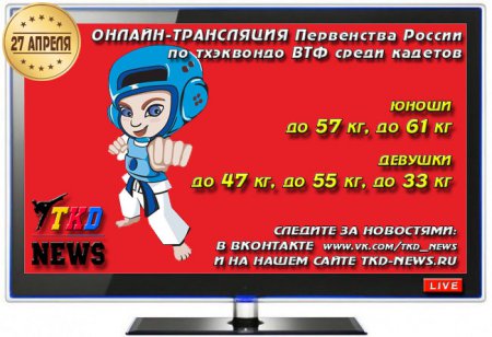 27 апреля - первый день Первенства России по тхэквондо ВТФ среди кадетов. В этот день спор за медали поведут юноши до 57 кг, до 61 кг и девушки до 33 кг, до 47 кг, до 55 кг. Доступна прямая трансляция. Сетки для всех весовых категорий этого дня ...