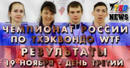 В третий день чемпионами России по тхэквондо ВТФ стали Усенко Полина (женщины до 46 кг), Джамансартова Оксана (женщины до 67 кг), Каргаполов Сергей (мужчины до 58 кг) и Кривейченко Никита (мужчины до 74 кг).
