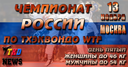 13 ноября, в заключительный день Чемпионата России по тхэквондо ВТФ будет разыграно два комплекта наград в весовых категориях у женщин до 46 кг и у мужчин до 54 кг. Сетки пятого дня в прилагаемых файлах. Следить за ходом поединков ...