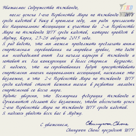 23-26 августа, в Муджу (Южная Корея), состоится второе Первенство Мира по тхэквондо ВТФ среди кадетов. 20-22 августа будет проходить регистрация команд, а затем в течении четырёх дней в напряжённых поединках будет разыграно 20 комплектов медалей. Напомним, Первое Первенство Мира состоялось ровно год назад в Баку, в нём приняло участие 575 спортсменов из шестидесяти двух стран мира, и оно имело огромный успех. Президент WTF Chungwon Choue уверил, что Всемирная Федерация тхэквондо и Оргкомитет турнира сделаю всё от них зависящее, что бы это событие стало незабываемым.
