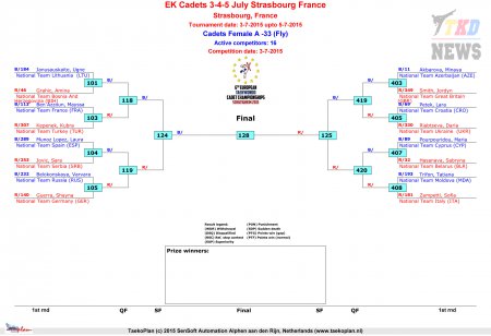 Сегодня, 2 июля, в Страсбурге состоялась жеребьёвка поединков первого дня VI Первенства Европы по тхэквондо ВТФ среди кадетов. Были составлены турнирные сетки в весовых категориях у девушек до 29 кг, до 33 кг, до 37 кг и у юношей до 33 кг, до 37 кг, до 41 кг, до 45 кг. На данный момент организаторы заявляют, что никаких прямых видеотрансляций не запланировано. Единственная возможность следить за турниром на сайте регистрации по ссылке http://tpss.eu/LiveResults.asp. Мы в свою очередь постараемся связаться с участниками турнира и освещать Первенство Европы в комментариях и новостях.