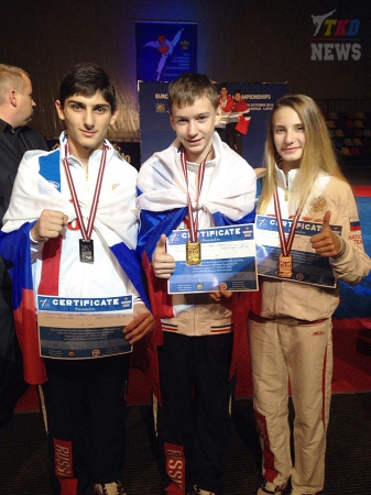 В первый день Первенства Европы по тхэквондо WTF среди юниоров, сборная команда Испании завоевала две золотых и две бронзовых медали и вырвалась вперёд в командном зачёте. Второе место занимает сборная России одной золотой, серебряной и бронзовой медалями. Третье место делят команды Турции и Хорватии - по одной золотой и брозовой медали. Победителями стали испанцы Marcos Caballero Echevarria (юниоры до 59 кг) и Irene Laguna Perez (юниорки до 42 кг), спортсмен из России Канаев Андрей (юниоры до 45 кг), турок Emre Gul (юниоры до 78 кг) и хорватка Bruna Vuletic (юниорки до 52 кг).