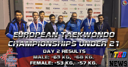 Победителями второго дня Первенства Европы по тхэквондо ВТФ среди молодёжи стали турок Hakan Recber (мужчины до 63 кг), россиянин Владислав Югай (мужчины до 68 кг), спортсменка из Германии Madeline Folgmann (женщины до 53 кг) и полячка Patrycja Adamkiewicz (женщины до 57 кг). Российские спортсмены Никита Пушанко, Борис Краснов положили в копилку Сборной России серебряные и Алёна Миронюк - бронзовую награды. Накануне третьего дня соревнований Россия вырвалась вперёд в командном зачёте - одна золотая, две серебряные и шесть бронзовых медалей. На втором месте Сборная Турции - одна золотая, две серебряные и две бронзовые медали. Третье место у немецкой команды, имеющей в своей копилке по одной золотой и серебряной медали и две бронзовых.
