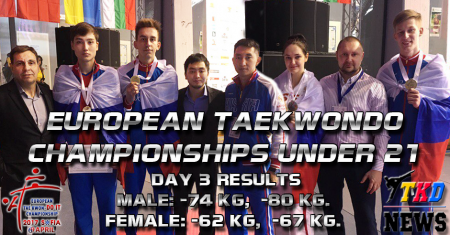 Победителями третьего дня Первенства Европы по тхэквондо ВТФ среди молодёжи стали россиянин Дмитрий Артюхов (мужчины до 74 кг), турок Hasan Can Lazoglu (мужчины до 80 кг), спортсменка из Греции Ioanna Desylla (женщины до 62 кг) и итальянка Daniela Rotolo (женщины до 67 кг). В этот день Сборная России точь-в-точь повторила свой результат предыдущего дня. Российские спортсмены Юлия Турутина, Дали Ишбердин положили в копилку Сборной России серебряные и Иван Морозов - бронзовую награды. Сборная России укрепила своё лидерство в командном зачёте, однако, вслед ей дышат команды Турции и Италии, расположившиеся на втором и третьем месте соответственно.