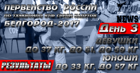 Золото и титул победителя Первенства России по тхэквондо ВТФ среди кадетов в третий день соревнований завоевали Костарева Дарья (девушки до 37 кг), Гродня Влада (девушки до 51 кг), Хузина Лилия (девушки до 59 кг), Гикматов Илья (юноши до 33 кг) и Бурденюк Артём (юноши до 57 кг). С остальными результатами можно будет ознакомиться по окончании соревнований.