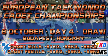 8 октября, в заключительный день на Первенстве Европы по тхэквондо среди кадетов, которое принимает Будапешт, разыграют шесть комплектов наград. В этот день соревнований пройдут поединки у девушек в весовых категориях до 55 кг, до 59 кг, свыше 59 кг и юношей - до 61 кг, до 65 кг, свыше 65 кг. Следить за турниром можно на нашем сайте по ссылке Live European Taekwondo Cadet Championships Budapest-2017 и в комментариях к новости в нашем паблике в ВКонтакте. Сетки четвёртого дня в прилагаемых файлах.