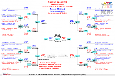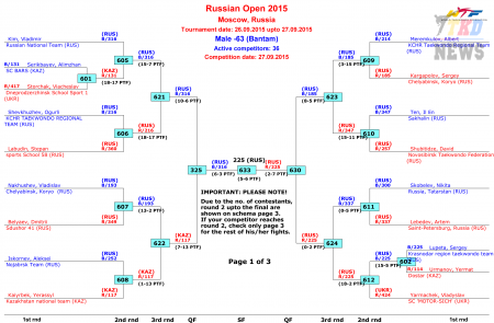 27 сентября, во второй день рейтингового турнира по тхэквондо ВТФ "RUSSIAN OPEN 2015" были разыграны комплекты наград в весовых категориях у женщин до 46 кг, до 53 кг, до 62 кг, до 73 кг, у мужчин до 54 кг, до 63 кг, до 74 кг и до 87 кг. В прикреплённых файлах списки медалистов, сетки с результатами поединков за всё время турнира, а так же итоги командного зачёта (по странам и по командам).