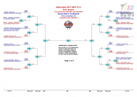4 марта в столице Болгарии, городе София, стартовал рейтинговый турнир по тхэквондо WTF G1-класса "Sofia Open 2017". В первый день прошли соревнования среди кадетов и среди юниоров, а во второй день состоятся поединки среди детей и рейтинговые поединки среди мужчин и среди женщин. Результаты первого дня, сетки второго дня и ссылка на прямую текстовую трансляцию опубликованы ниже.