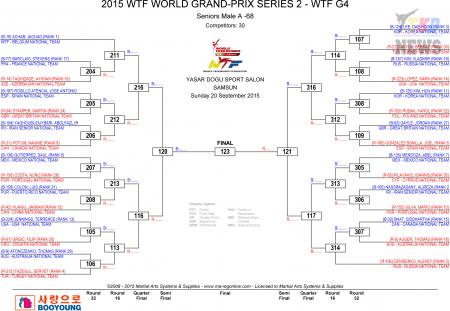 20 сентября, в заключительный день второго этапа турнира по тхэквондо ВТФ Мировой серии "Grand Prix" 2015 года, будет разыграно два комплекта наград в весовых категориях у женщин до 57 кг и у мужчин до 68 кг. С сетками третьего дня можно ознакомиться ниже и в прилагаемом файле. Прямые трансляции будут вестись с трёх доянгов.