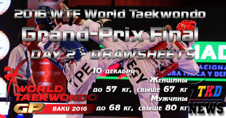 10 декабря, во второй день финала турнира по тхэквондо ВТФ Мировой серии "Grand Prix" 2016 года, состоятся поединки в весовых категориях у женщин - до 57 кг и свыше 67 кг, у мужчин - до 68 кг и свыше 80 кг. Победитель получит 80 рейтинговых баллов и денежный приз в 6000 $. Начало соревнований в 9:00 по Баку. Организаторы турнира обещали вести трансляцию, начиная с четвертьфиналов. Сетки соревнований второго дня приведены ниже и в прилагаемом файле.