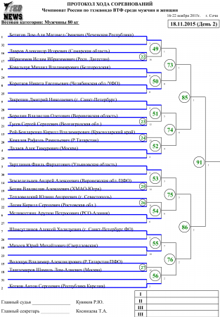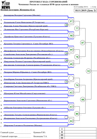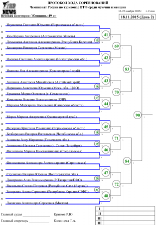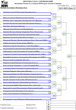 Чемпионат России по тхэквондо ВТФ Сочи-2015. День второй. Сетки. Published 18 November 2015 г. в 09:54 Moscow time 18-11-2015, 09:54 по Москве Национальные Чемпионаты и Первенства / Kyorugi 2 097 0 Чемпионат России по тхэквондо ВТФ Во второй день Чемпионата России по тхэквондо ВТФ будут разыграны медали у женщин в весовых категориях до 49 кг, до 62 кг и у мужчин в весовых категориях до 54 кг, до 80 кг. Сетки второго дня прилагаются.
