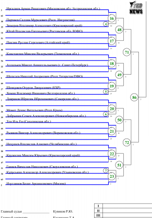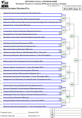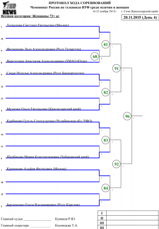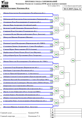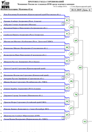 Чемпионат России по тхэквондо ВТФ Сочи-2015. День четвёртый. Сетки. Published 20 November 2015 г. в 16:03 Moscow time 20-11-2015, 16:03 по Москве Национальные Чемпионаты и Первенства / Kyorugi 2 121 0 Чемпионат России по тхэквондо ВТФ В заключительный день Чемпионата России по тхэквондо ВТФ, будут разыграны медали у женщин в весовых категориях свыше 73 кг и у мужчин в весовых категориях до 63 кг, до 68 кг и до 87 кг. Сетки четвёртого дня соревнований прилагаются.