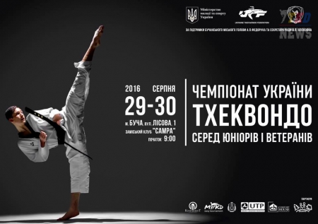 29 и 30 августа 2016 года в городе Буча, Киевская область, состоятся Чемпионат Украины по тхэквондо ВТФ среди юниоров и Чемпионат Украины по тхэквондо ВТФ среди ветеранов. Юниорский Чемпионат Украины станет основным этапом отбора в сборную команду страны для участия в Первенстве Мира среди юниоров, которое проходить с 16 по 20 ноября в в канадском городе Бёрнаби. Параллельно юниорскому чемпионату 29 августа состоится Чемпионат Украины по тхэквондо ВТФ среди ветеранов. На ветеранском чемпионате страны спортсмены сразятся за медали в пяти возрастных категориях: 30-35 лет, 36-41, 42-46, 47-51 и 52-58 лет.