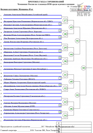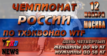 12 ноября, на проходящем в Москве, Чемпионате России по тхэквондо ВТФ будет разыграно два комплекта наград: у женщин, в весовой категории до 49 кг, и у мужчин, в весовой категории до 58 кг. Сетки четвёртого дня в прилагаемых файлах. Следить за ходом поединков можно в комментариях к новости этого дня в нашем официальном паблике в ВКонтакте.