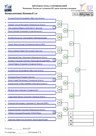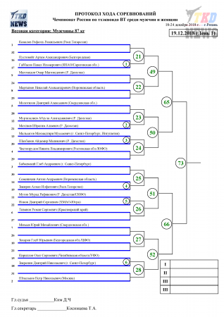 19 декабря, в Рязани, стартует Чемпионат России по тхэквондо среди мужчин и женщин. В первый день соревнований будет разыграно четыре комплекта наград. Поединки за титул чемпиона России пройдут у женщин в весовых категориях до 53 кг, свыше 73 кг и у мужчин - до 87 кг, свыше 87 кг. Сетки первого дня в прилагаемых файлах. Следить за ходом поединков можно в комментариях к новости этого дня в нашем официальном паблике в ВКонтакте.
