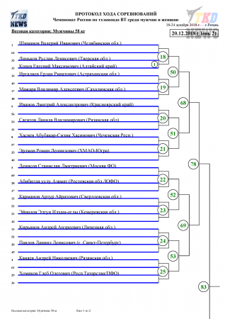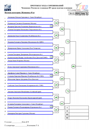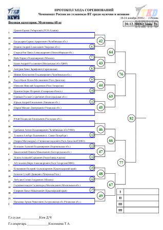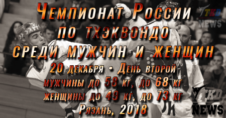 20 декабря, во второй день Чемпионата России по тхэквондо среди мужчин и женщин будут разыграны комплекты наград у женщин в весовых категориях до 49 кг, до 73 кг и у мужчин — до 58 кг, до 68 кг. Прямые трансляции будут вестись со всех четырёх кортов. Сетки второго дня в прилагаемых файлах. Следить за ходом поединков можно в комментариях к новости этого дня в нашем официальном паблике в ВКонтакте.