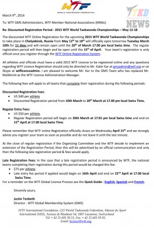 10 марта 2015 года открылась официальная онлайн-регистрация спортсменов на XXII Чемпионат Мира по тхэквондо WTF, который состоится 12-18 мая в Челябинске. В течении 11 дней, до 17:00 по швейцарскому времени 20 марта, при регистрации будет предоставляться скидка и вступительный взнос на каждого спортсмена составит 40 долларов США. По истечении этого срока онлайн регистрация продолжится до 17:00 по швейцарскому времени 15 апреля и вступительный взнос составит 50 долларов США.